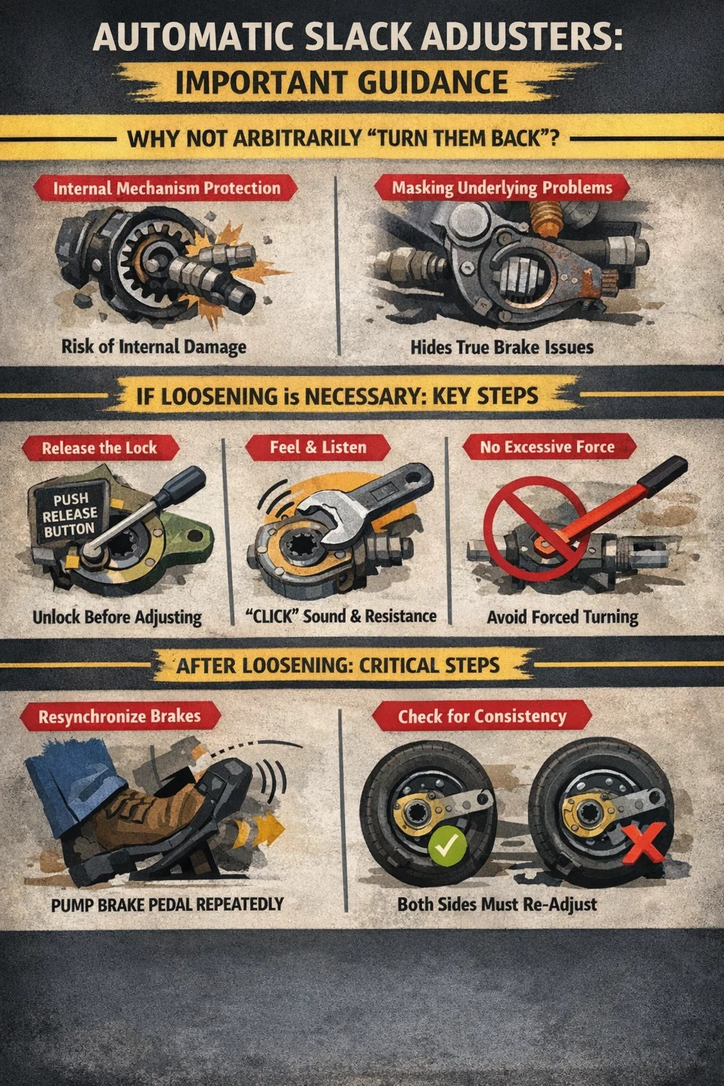 Huruvida automatiska slackjusterare kan lossas manuellt (kallas vanligen "vända tillbaka dem") är en avgörande detalj vid fordonsunderhåll.