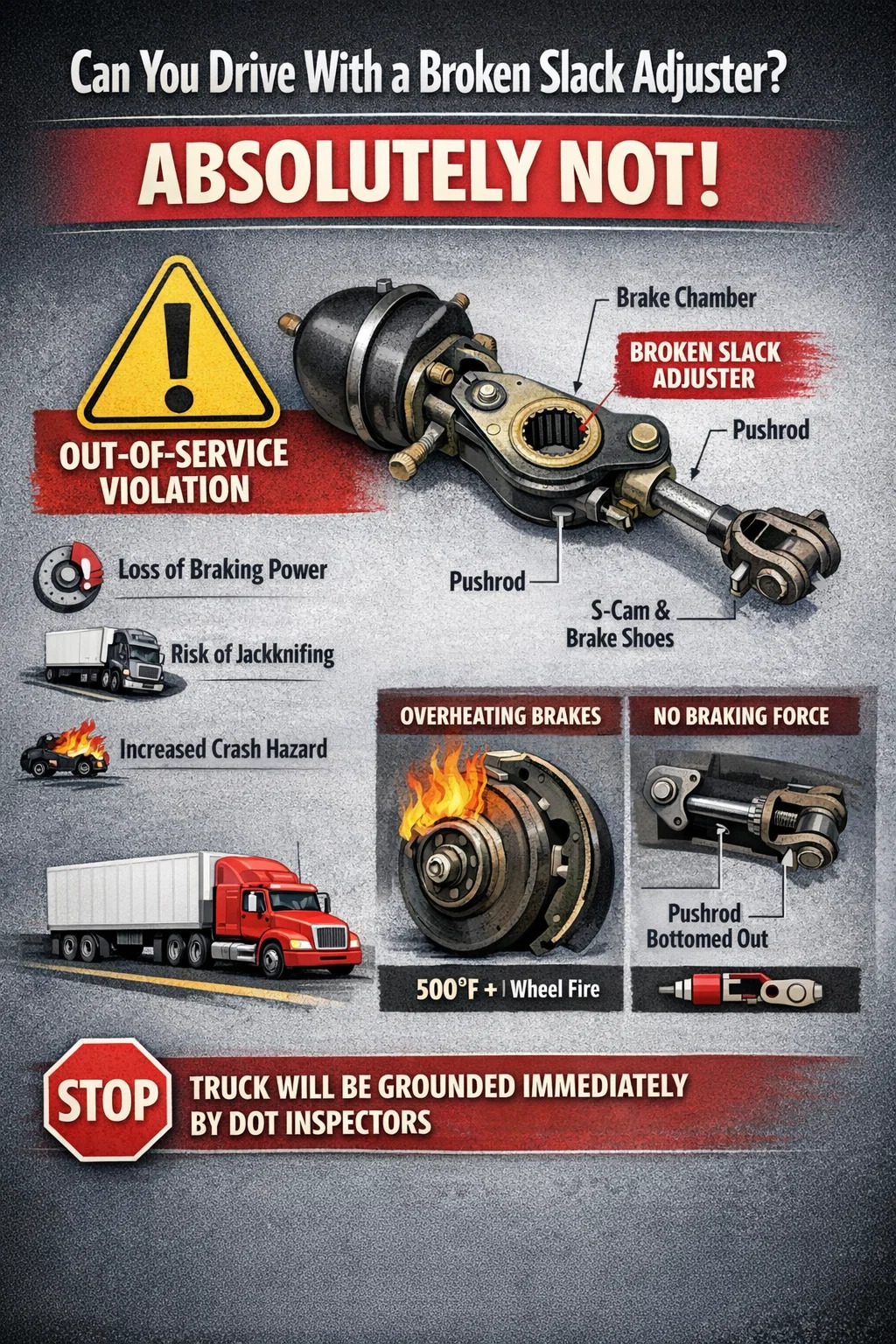 Det korta svaret är absolut inte. Du kan inte lagligt eller säkert köra ett nyttofordon med en trasig, felaktig eller felaktigt justerad slackjusterare. I ögonen på Department of Transportation (DOT) och säkerhetsinspektörer, en trasig slackjusterare är en överträdelse "utan drift". Om du ertappas med att köra ett fordon med denna defekt kommer din lastbil omedelbart att jordas på inspektionsplatsen.