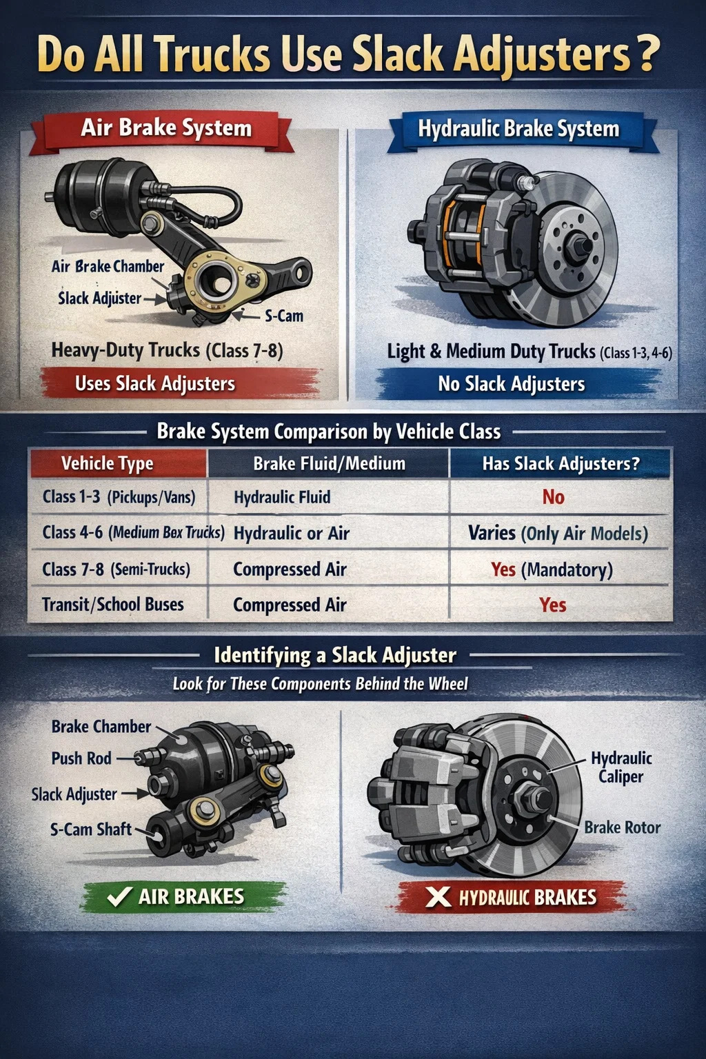 Nej, inte alla lastbilar har slackjusterare. Huruvida en lastbil är utrustad med dessa komponenter beror helt på dess bromssystem. Specifikt, slackjusterare är en grundläggande del av luftbromssystem som finns på tunga kommersiella fordon (klass 7 och klass 8 lastbilar). Lätta lastbilar, såsom vanliga pickuper (klass 1-3), och många medeltunga lådbilar använder hydrauliska bromssystem, som inte använder en mekanism för slackjustering för att upprätthålla bromsbackar eller beläggsavstånd.
