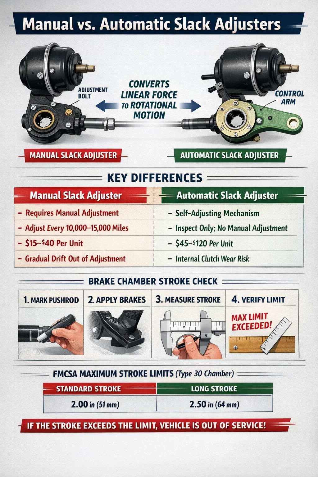 Det lagstadgade maximala bromskammarslaget i Nejrdamerika enligt FMCSA-reglerna definieras av kammarstorleken - för en typ 30-kammare är den gränsen 2 tum (51 mm). Överskrid den och fordonet tas ur drift. En slackjusterare som är ojusterad, gripen eller sliten är en av de vanligaste anledningarna till att kommersiella lastbilar misslyckas med nivå I vägkontroller.
