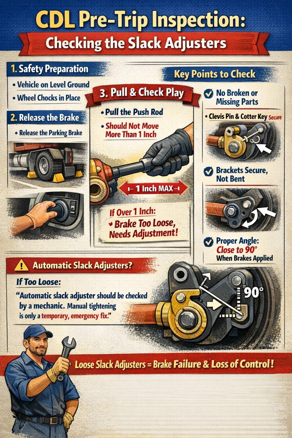 I processen för att erhålla ett kommersiellt körkort (CDL) är inspektionen före resan en avgörande del, och inspektionen av slackjusterare är en av de saker som examinatorerna fokuserar mest på.