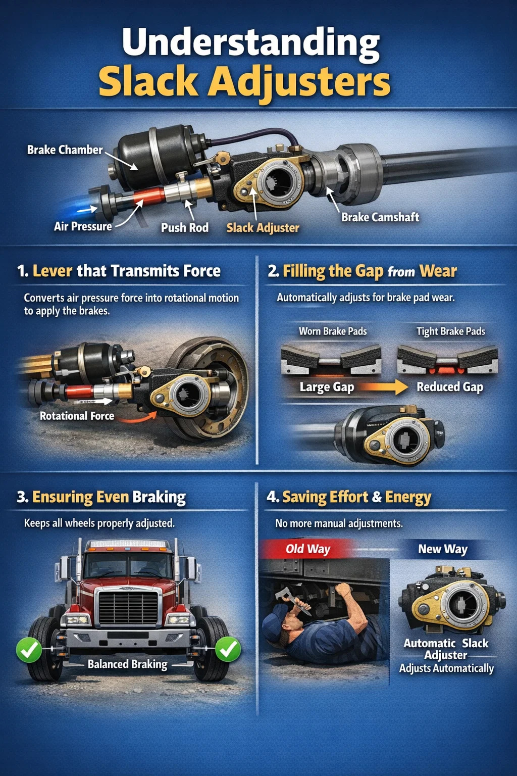 Tidigare var erfarna förare tvungna att ofta krypa under fordonet och manuellt justera dessa justerare med en skiftnyckel för att säkerställa att bromsarna fungerade korrekt. Moderna automatiska slackjusterare är mycket mer sofistikerade. De kan känna av om bromsspelet är för stort under normal inbromsning och justerar det automatiskt därefter.